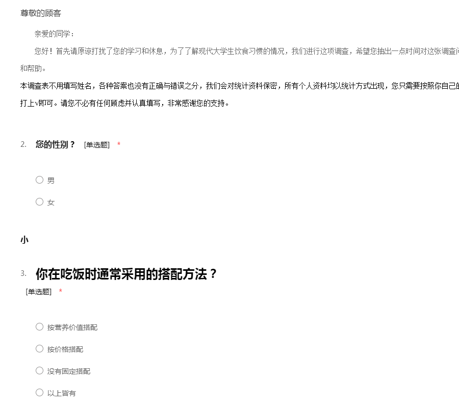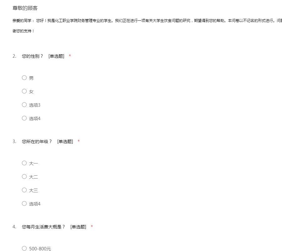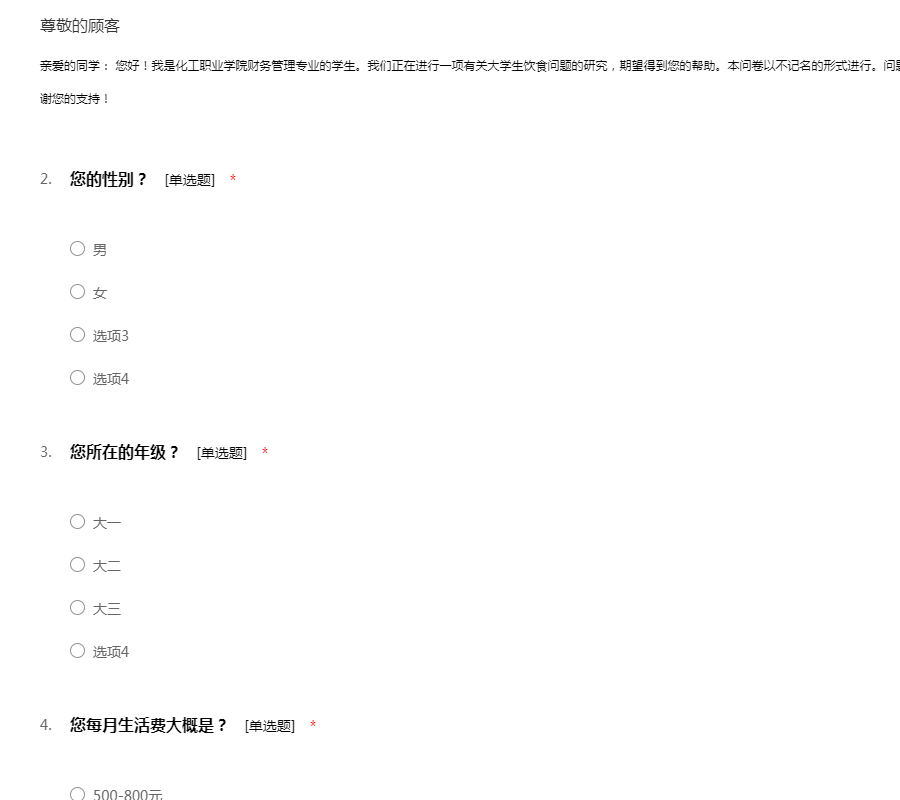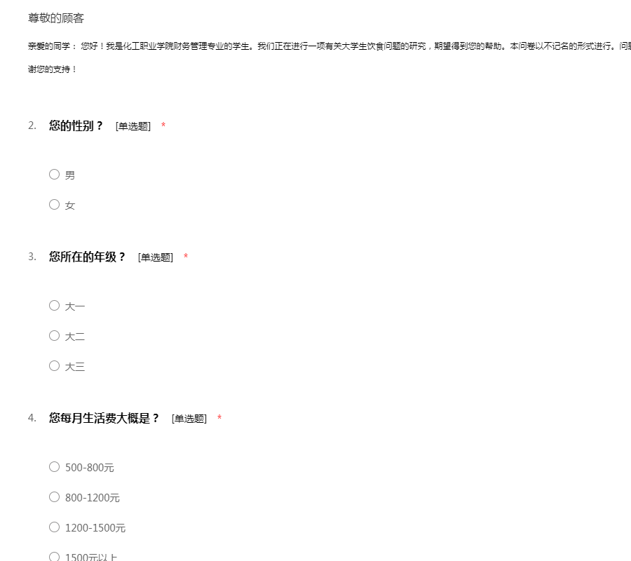 亲爱的同学: 您好!我是化工职业学院财务管理专业的学生。我们正在进行一项有关大学生饮食问题的研究,期望得到您的帮助。本问卷以不记名的形式进行。问题不涉及您的隐私,请您如实填写以下信息。谢谢您的支持!
