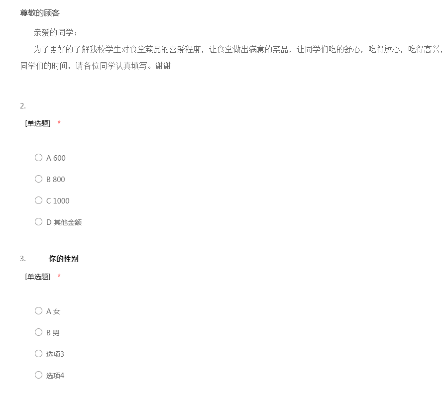亲爱的同学:为了更好的了解我校学生对食堂菜品的喜爱程度,让食堂做出满意的菜品,让同学们吃的舒心,吃得放心,吃得高兴,特开展此次问卷调查,非常抱歉占用同学们的时间,请各位同学认真填写。谢谢