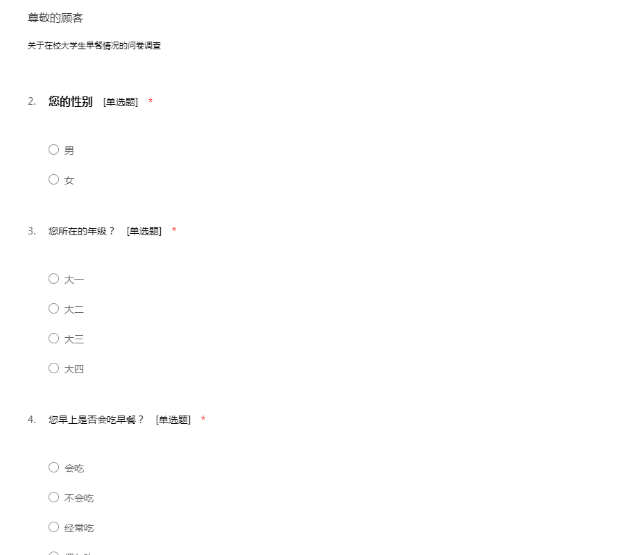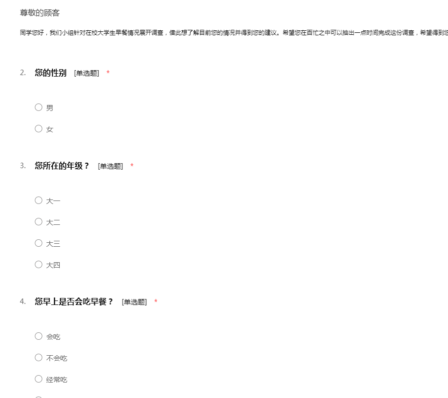 同学您好,我们小组针对在校大学生早餐情况展开调查,借此想了解目前您的情况并得到您的建议。希望您在百忙之中可以抽出一点时间完成这份调查,希望得到您的的大力支持!万分感谢!