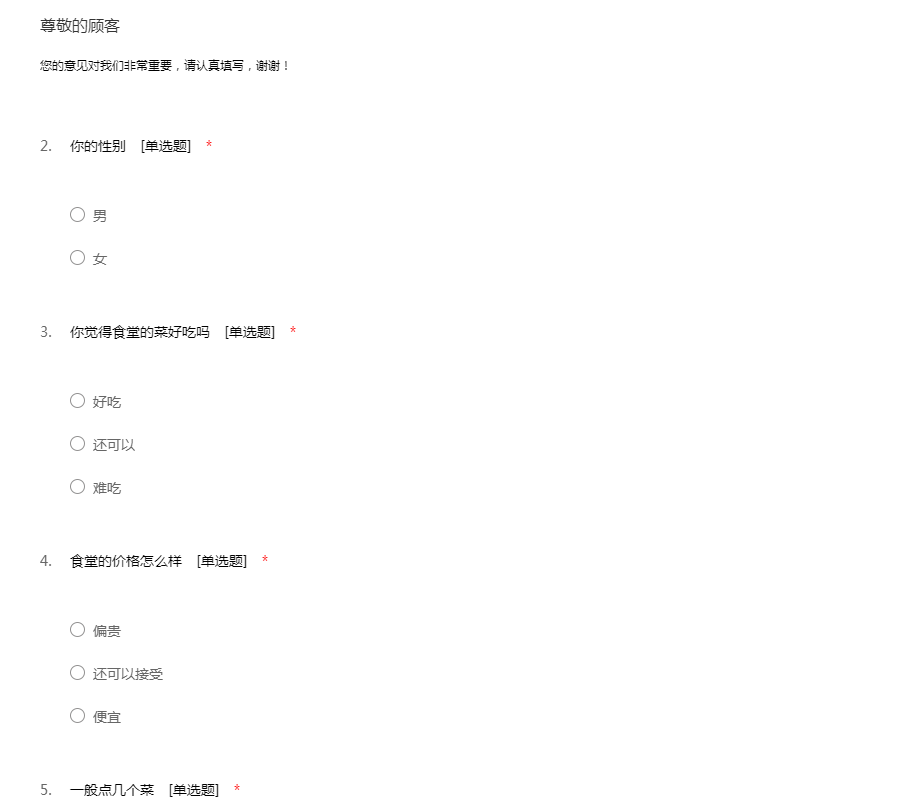 亲爱的同学们: 你好!我们在做市场营销学的问卷作业,了解下学校食堂的情况,请同学们认真回答下以下的问题,如果数据真实有效,我们还可以把问题反馈给学校,感谢你们的支持与配合!由我要调查网(www.51diaocha.com)提供。