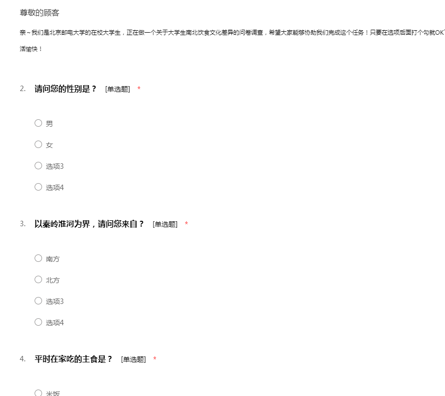 亲~我们是北京邮电大学的在校大学生,正在做一个关于大学生南北饮食文化差异的问卷调查,希望大家能够协助我们完成这个任务!只要在选项后面打个勾就OK了,简单不费时,在此诚挚的感谢各位!祝您生活愉快!