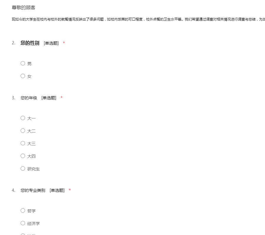 感谢您参与“学校食堂满意度调查问卷”,本次调查是为了了解大学生对学校食堂的满意度,调查所得的结果对您的工作和生活不会带来任何不良影响,请您根据自己的实际情况放心填写,51调查网感谢您的配合!