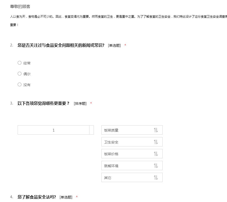 人以食为天,食物是必不可少的。因此,食堂变得尤为重要。然而食堂的卫生,更是重中之重。为了了解食堂的卫生安全,我们特此设计了这份食堂卫生安全调查表。本问卷采取不记名方式,您的建议对我们非常重要!
