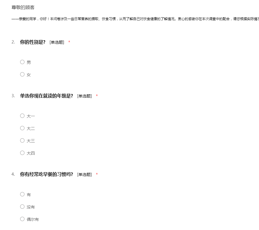 ——亲爱的同学,你好!本问卷涉及一些日常营养的摄取、饮食习惯,从而了解自己对饮食健康的了解情况。衷心的感谢你在本次调查中的配合,请您根据实际情况认真填写调查表。谢谢支持,祝您身体健康!
