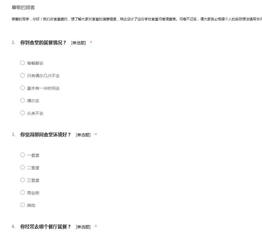 亲爱的同学,你好!我们收食堂委托,想了解大家对食堂的满意程度,特此设计了这份学校食堂问卷调查表。问卷不记名,请大家务必根据个人的实际想法填写本问卷。感谢你的配合与支持!