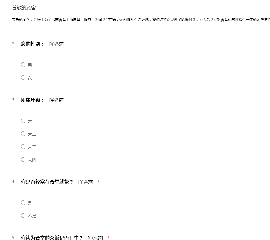 亲爱的同学们,你好!由于我们课程的教学要求,我们对学院食堂伙食的满意度情况进行一次的调查问卷,以便更好地改善伙食。在此我们想向你了解一下相关问题,希望你能抽出几分钟宝贵时间协助我们开展本次调查。谢谢你的积极参与与大力支持!