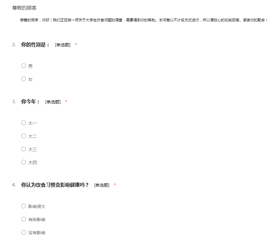 ——亲爱的同学,你好!我们正在做一项关于大学生饮食问题的调查,需要得到你的帮助。本问卷以不计名方式进行,所以请放心的如实回答。感谢你的配合!