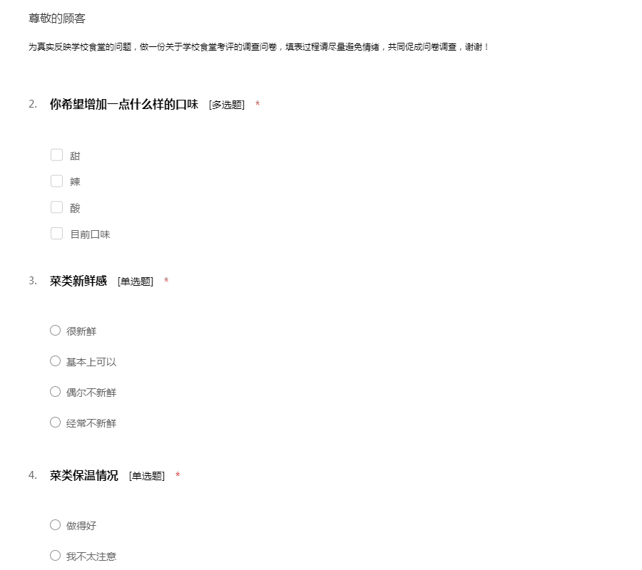 为真实反映学校食堂的问题,做一份关于学校食堂考评的调查问卷,填表过程请尽量避免情绪,共同促成问卷调查,谢谢!