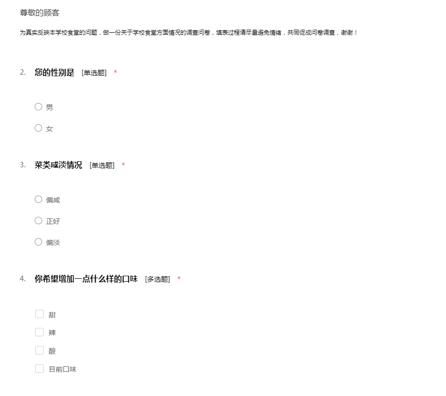 为真实反映本学校食堂的问题,做一份关于学校食堂方面情况的调查问卷,填表过程请尽量避免情绪,共同促成问卷调查,谢谢!