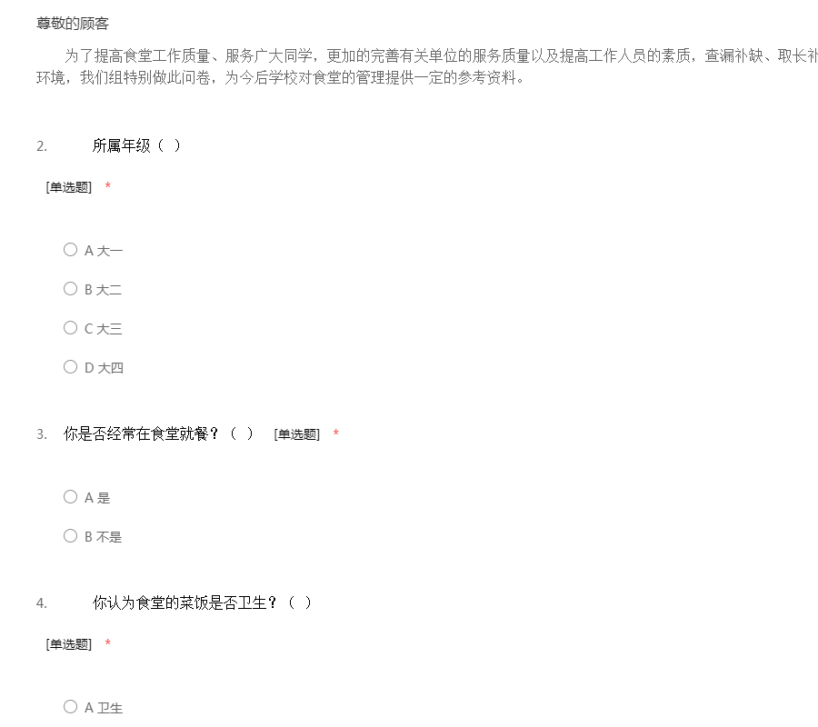 为了提高食堂工作质量、服务广大同学,更加的完善有关单位的服务质量以及提高工作人员的素质,查漏补缺、取长补短,为同学们带来更佳舒适的生活环境,我们组特别做此问卷,为今后学校对食堂的管理提供一定的参考资料。