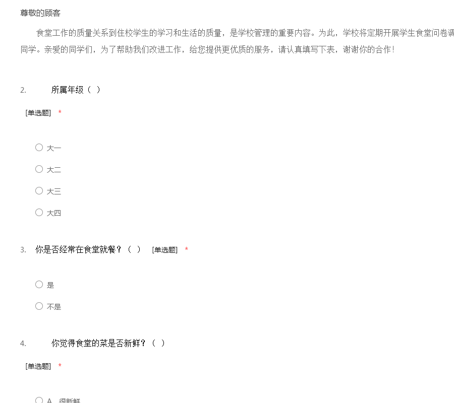 为了了解同学们对学校各饭堂的满意度,更好地促进各食堂改善服务,请您抽出一点宝贵时间,参加此次食堂满意度调查工作。非常感谢您的参与!