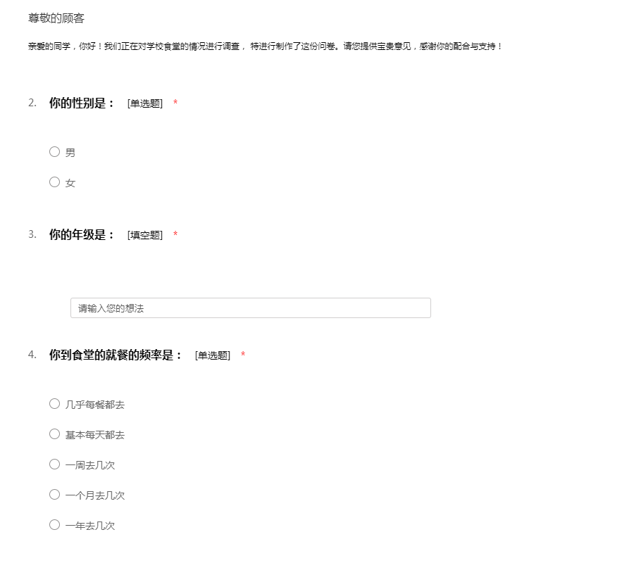 亲爱的同学,你好!我们正在对学校食堂的情况进行调查, 特进行制作了这份问卷。请您提供宝贵意见,感谢你的配合与支持!