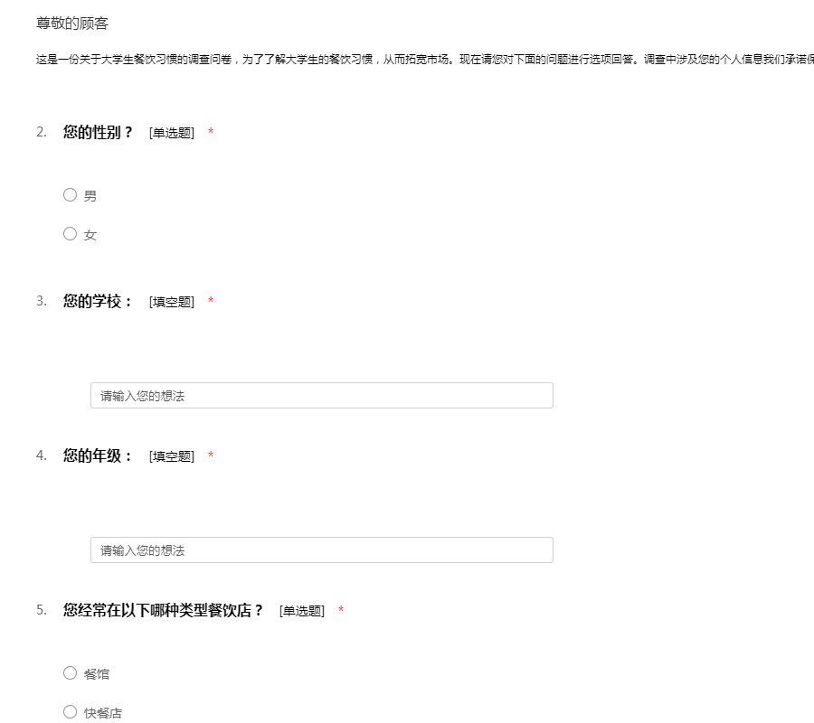 这是一份关于大学生餐饮习惯的调查问卷,为了了解大学生的餐饮习惯,从而拓宽市场。现在请您对下面的问题进行选项回答。调查中涉及您的个人信息我们承诺保密。真诚的感谢您的参与!