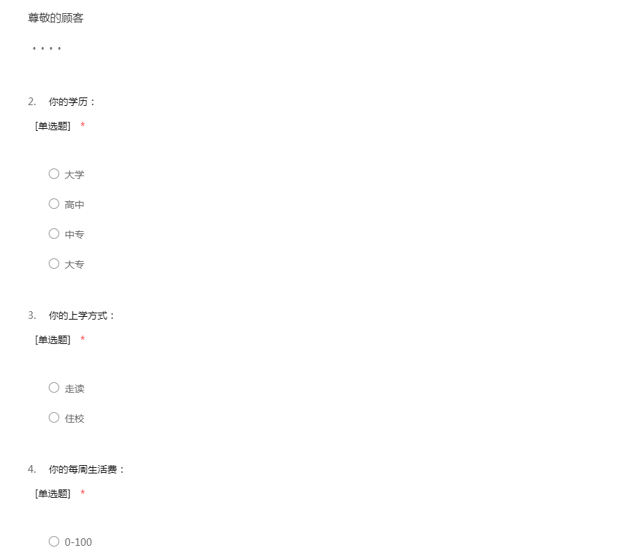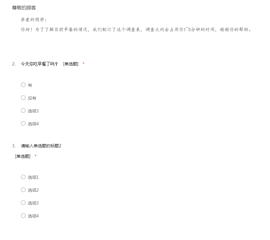 亲爱的同学: 你好!为了了解目前早餐的情况,我们制订了这个调查表,调查大约会占用你1~5分钟的时间,谢谢你的帮助。