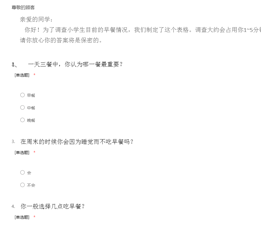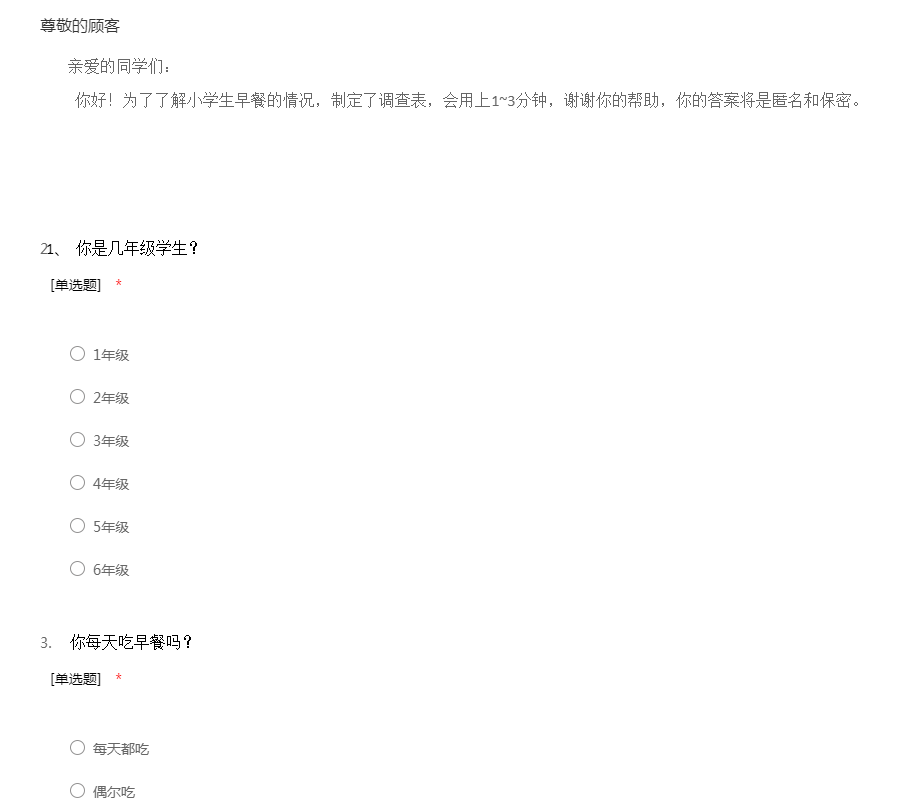 亲爱的同学们: 你好!为了了解小学生早餐的情况,制定了调查表,会用上1~3分钟,谢谢你的帮助,你的答案将是匿名和保密。