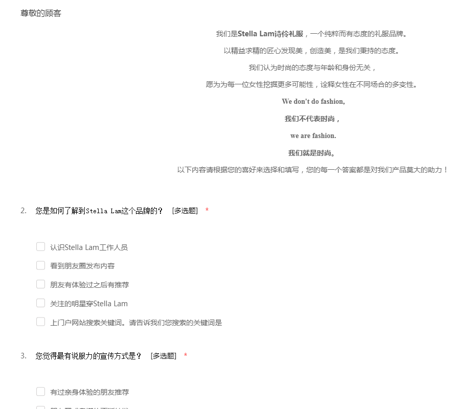 我们是Stella Lam诗伶礼服,一个纯粹而有态度的礼服品牌。 以精益求精的匠心发现美,创造美,是我们秉持的态度。 我们认为时尚的态度与年龄和身份无关, 愿为为每一位女性挖掘更多可能性,诠释女性在不同场合的多变性。 We don't do fashion, 我们不代表时尚, we are fashion. 我们就是时尚。 以下内容请根据您的喜好来选择和填写,您的每一个答案都是对我们产品莫大的助力!