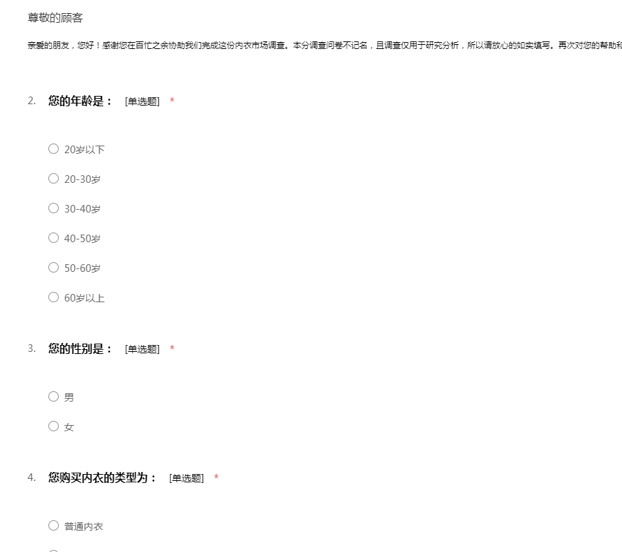 亲爱的朋友,您好!感谢您在百忙之余协助我们完成这份内衣市场调查。本分调查问卷不记名,且调查仅用于研究分析,所以请放心的如实填写。再次对您的帮助和支持表示感谢!