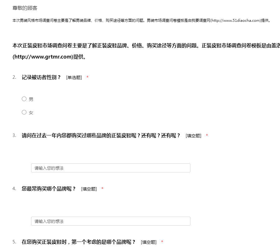 本次正装皮鞋市场调查问卷主要是了解正装皮鞋品牌、价格、购买途径等方面的问题。正装皮鞋市场调查问卷模板是由我要调查网(http://www.51diaocha.com)提供。