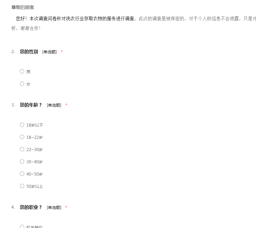 您好!本次调查问卷针对洗衣行业存取衣物的服务进行调查,此次的调查是被保密的,对于个人的信息不会泄露,只是对于调查数据和信息进行统计和分析,谢谢合作!