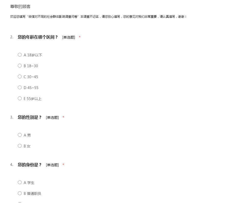 欢迎您填写“微信对不同的社会群体影响调查问卷”本调查不记名,请您放心填写,您的意见对我们非常重要,请认真填写,谢谢!
