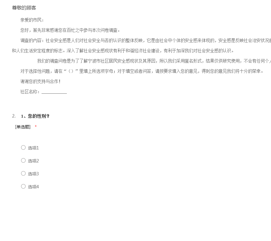 亲爱的市民:您好,首先非常感谢您在百忙之中参与本次问卷调查。调查的内容:社会安全感是人们对社会安全与否的认识的整体反映,它是由社会中个体的安全感来体现的,安全感是反映社会治安状况的重要标志之一,也是衡量社会运行机制和人们生活安定程度的标志。深入了解社会安全感现状有利于和谐经济社会建设,有利于加深我们对社会安全感的认识。 我们的调查问卷是为了了解宁波市社区居民安全感现状及其原因,所以我们采用匿名形式,结果仅供研究使用,不会有任何个人私人信息外漏。对于选择性问题,请在“()”里填上所选项字母;对于填空或者问答,请按要求填入您的意见,得到您的意见我们将十分的荣幸。谢谢您的支持与合作!社区名称:____________