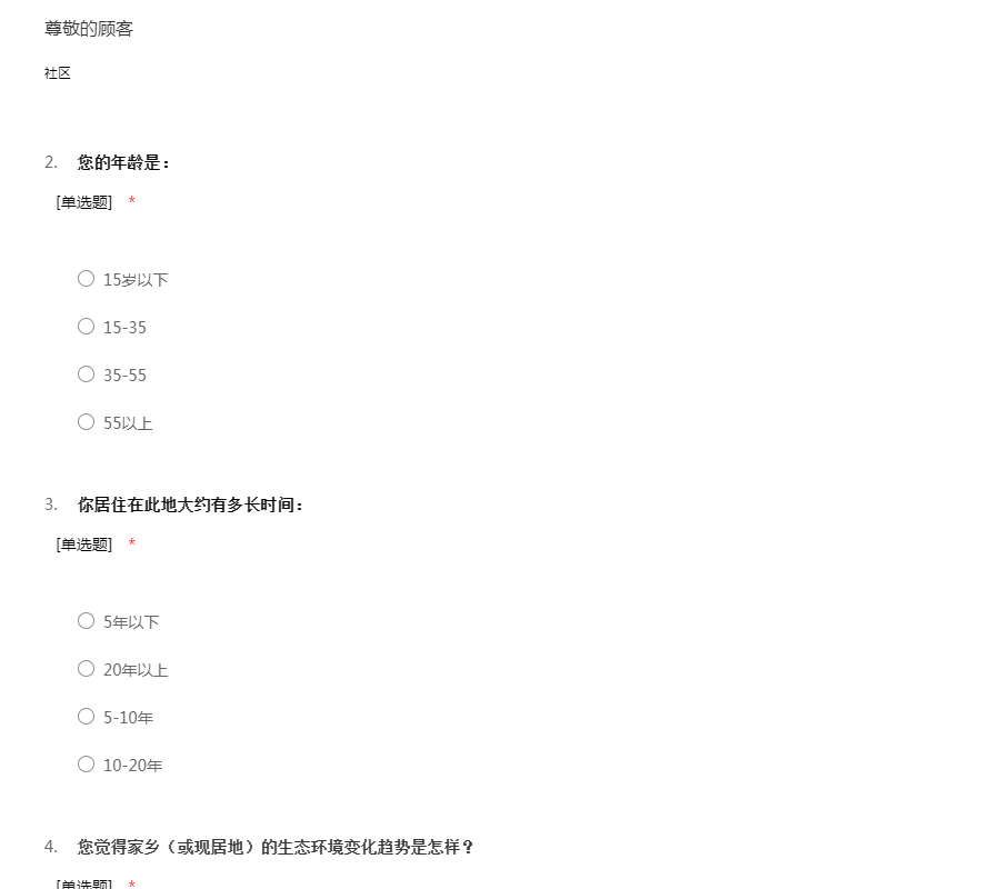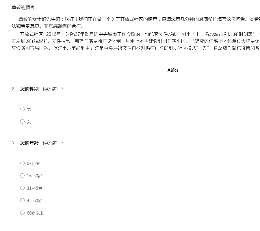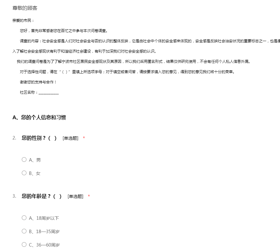 亲爱的市民:您好,首先非常感谢您在百忙之中参与本次问卷调查。调查的内容:社会安全感是人们对社会安全与否的认识的整体反映,它是由社会中个体的安全感来体现的,安全感是反映社会治安状况的重要标志之一,也是衡量社会运行机制和人们生活安定程度的标志。深入了解社会安全感现状有利于和谐经济社会建设,有利于加深我们对社会安全感的认识。 我们的调查问卷是为了了解宁波市社区居民安全感现状及其原因,所以我们采用匿名形式,结果仅供研究使用,不会有任何个人私人信息外漏。对于选择性问题,请在“()”里填上所选项字母;对于填空或者问答,请按要求填入您的意见,得到您的意见我们将十分的荣幸。谢谢您的支持与合作!社区名称:____________