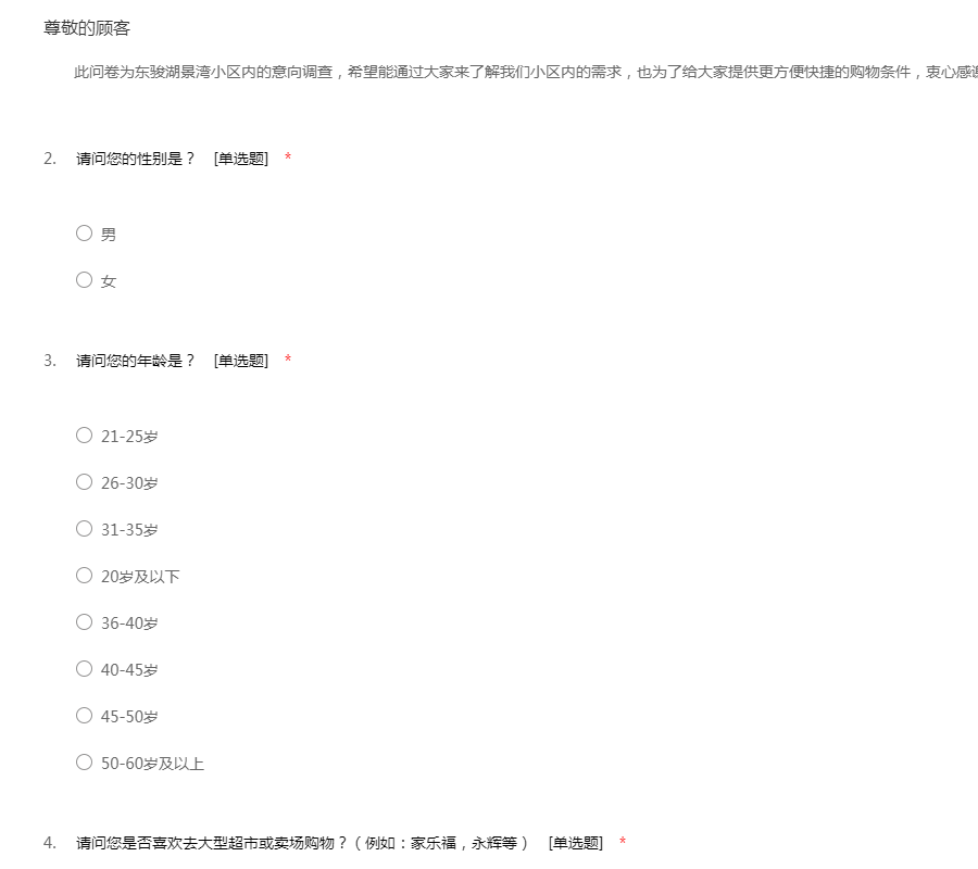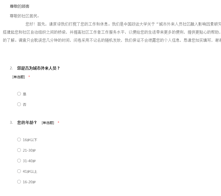 亲爱的市民:您好,首先非常感谢您在百忙之中参与本次问卷调查。调查的内容:社会安全感是人们对社会安全与否的认识的整体反映,它是由社会中个体的安全感来体现的,安全感是反映社会治安状况的重要标志之一,也是衡量社会运行机制和人们生活安定程度的标志。深入了解社会安全感现状有利于和谐经济社会建设,有利于加深我们对社会安全感的认识。 我们的调查问卷是为了了解宁波市社区居民安全感现状及其原因,所以我们采用匿名形式,结果仅供研究使用,不会有任何个人私人信息外漏。对于选择性问题,请在“()”里填上所选项字母;对于填空或者问答,请按要求填入您的意见,得到您的意见我们将十分的荣幸。谢谢您的支持与合作!社区名称:____________