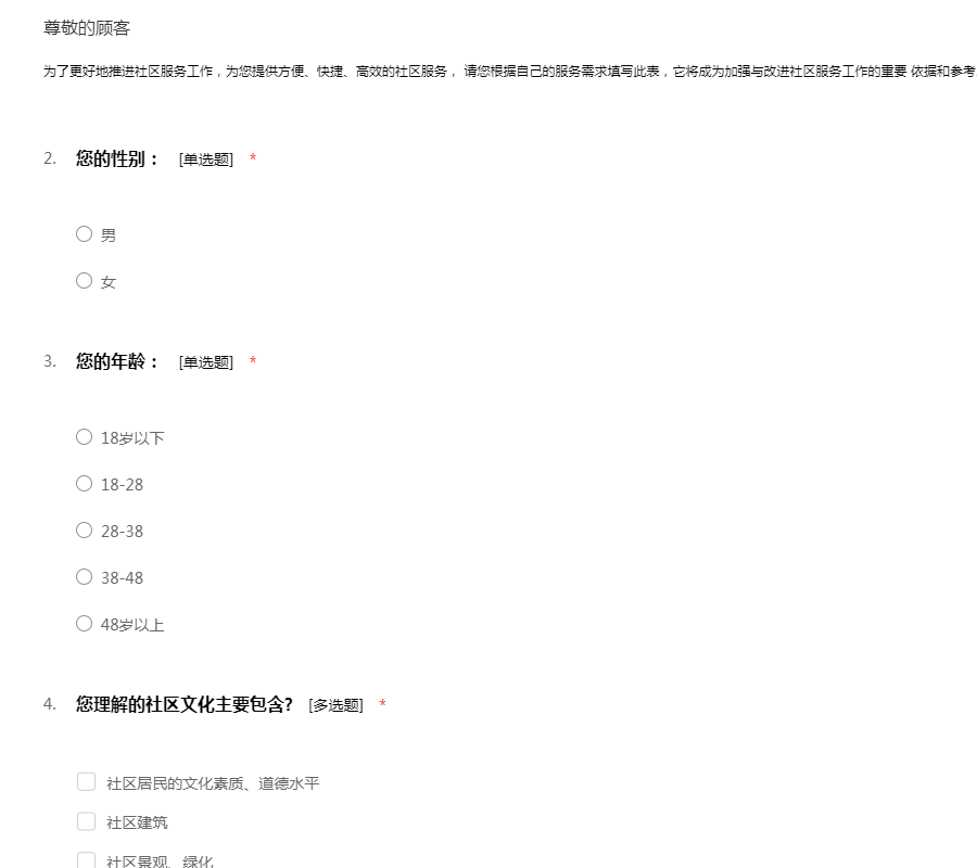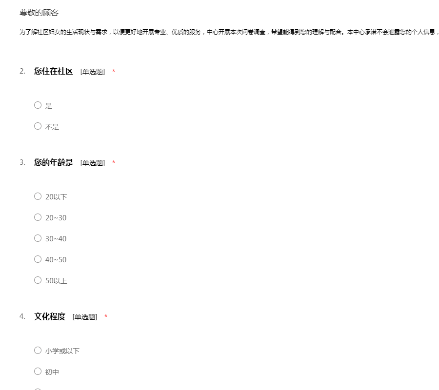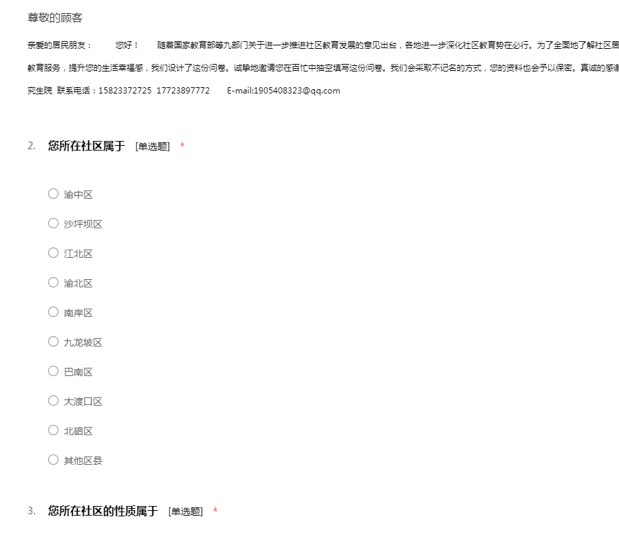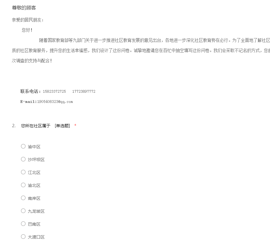 随着国家教育部等九部门关于进一步推进社区教育发展的意见出台,各地进一步深化社区教育势在必行。为了全面地了解社区居民的社区教育基本情况,为您提供更优质的社区教育服务,提升您的生活幸福感,我们设计了这份问卷。诚挚地邀请您在百忙中抽空填写这份问卷。我们会采取不记名的方式,您的资料也会予以保密。真诚的感谢您对本次调查的支持与配合!