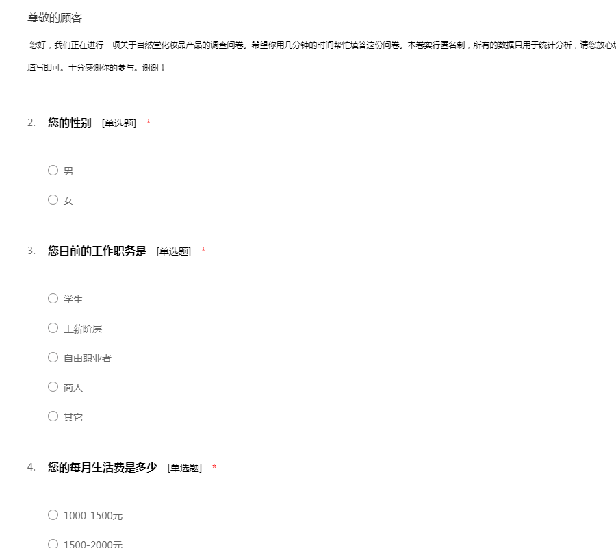 您好!感谢您在百忙之中抽出时间填写问卷,本次化妆品市场调研主要是为了了解化妆品品牌、价格、用户以及购买需求量等方面的问题,我们在此表示感谢!!