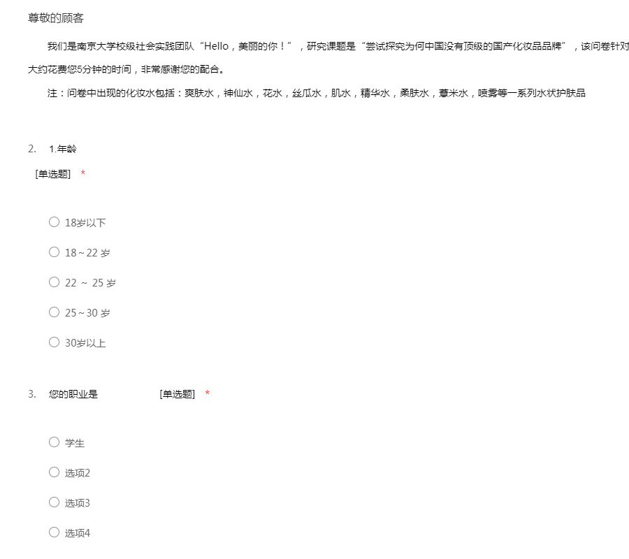 我们是南京大学校级社会实践团队“Hello,美丽的你!”,研究课题是“尝试探究为何中国没有顶级的国产化妆品品牌”,该问卷针对国内化妆水市场状况进行调查。此次调查大约花费您5分钟的时间,非常感谢您的配合。注:问卷中出现的化妆水包括:爽肤水,神仙水,花水,丝瓜水,肌水,精华水,柔肤水,薏米水,喷雾等一系列水状护肤品
