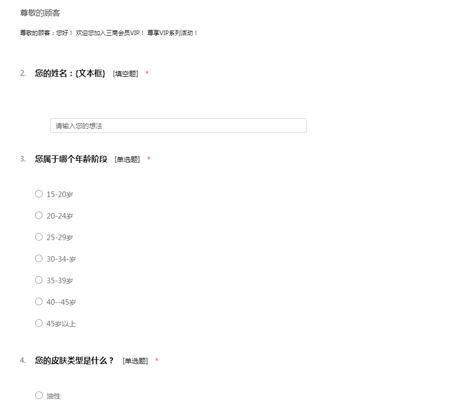 尊敬的参与者:您好!这份来自三商美妆问卷是关于消费者化妆品使用需求的研究,我们有兴趣了解消费者肌肤护理的需求,您对这份问卷的回答将给我们提供重要的信息。您的回答将帮助我们提升产品与服务,非常感谢您!