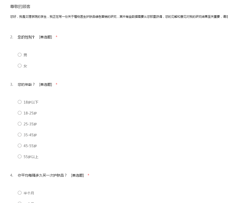 您好,我是文理学院的学生,我正在写一份关于植物医生护肤品绿色营销的研究,其中有些数据需要从您那里获得,您的见解和意见对我的研究结果至关重要,请您认真填写问卷,感谢您的积极支持和参与。