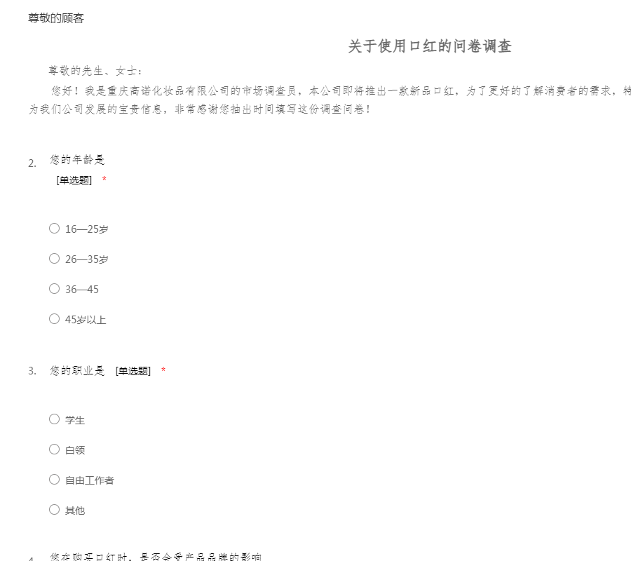 关于使用口红的问卷调查 尊敬的先生、女士: 您好!我是重庆高诺化妆品有限公司的市场调查员,本公司即将推出一款新品口红,为了更好的了解消费者的需求,特别展开此次调查。您的建议将会成为我们公司发展的宝贵信息,非常感谢您抽出时间填写这份调查问卷!