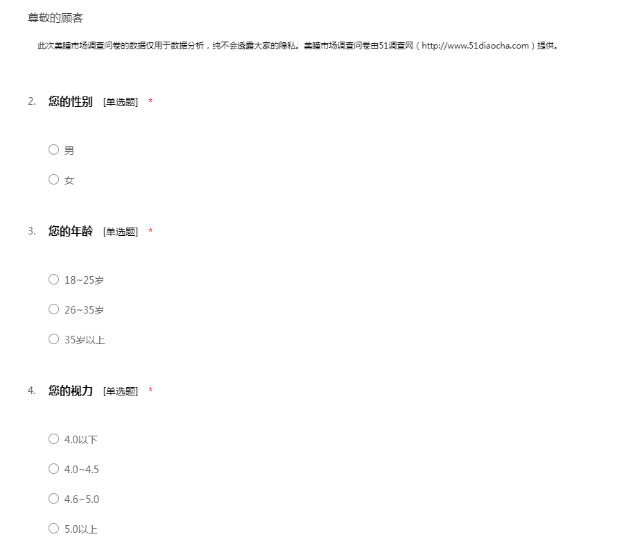 此次美瞳市场调查问卷的数据仅用于数据分析,纯不会透露大家的隐私。美瞳市场调查问卷由51调查网(http://www.51diaocha.com)提供。