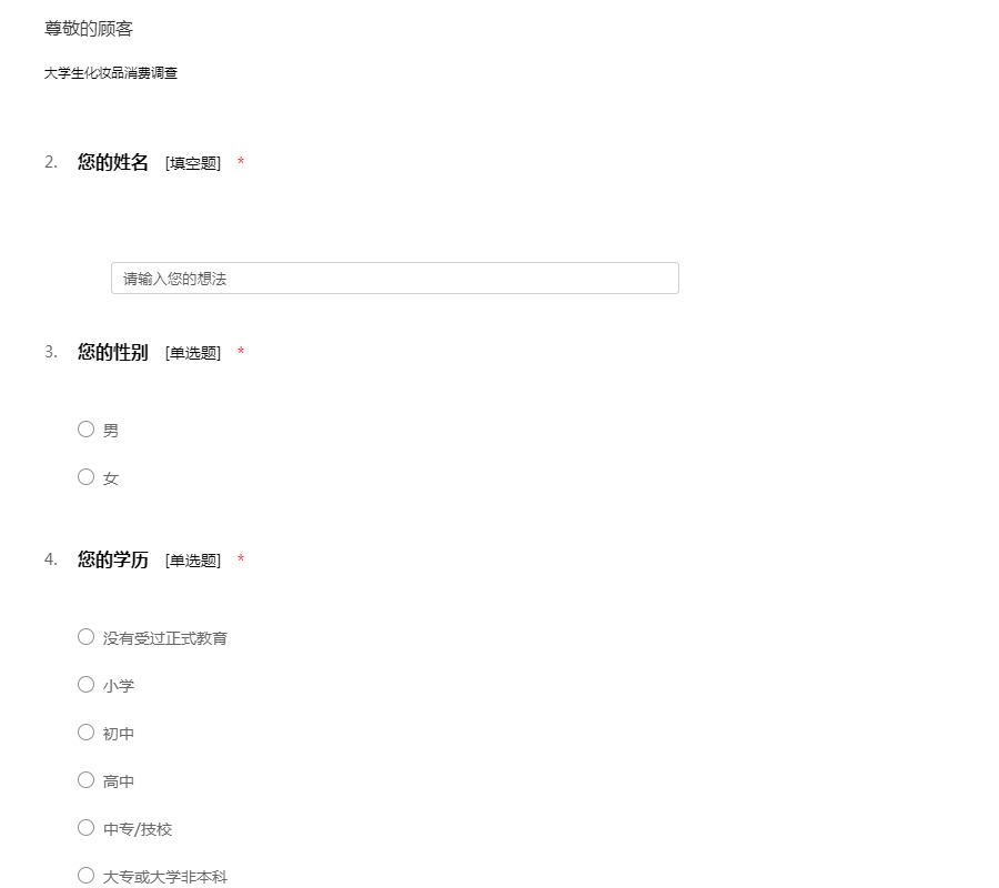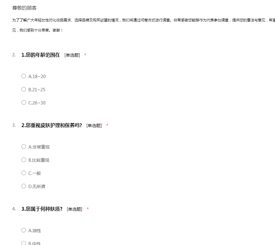 您好,我们是珠海城市职业技术学院的学生。随着时代的进步,护肤品、化妆品已经成为我们生活中的必需品,作为这个市场主体之一的大学生,我们更加不容忽视。于是我们设计了这份大学生化妆品问卷调查,意在了解大学生化妆品市场,了解大学生对于化妆品的需求。