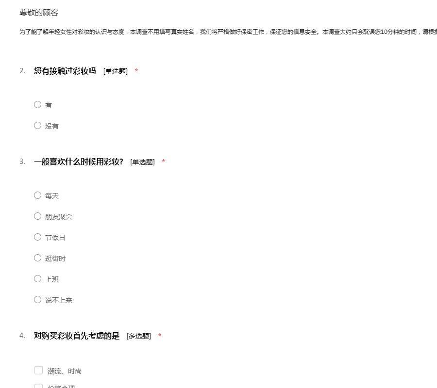为了能了解年轻女性对彩妆的认识与态度,本调查不用填写真实姓名,我们将严格做好保密工作,保证您的信息安全。本调查大约只会耽误您10分钟的时间,请根据您的实际情况填写。