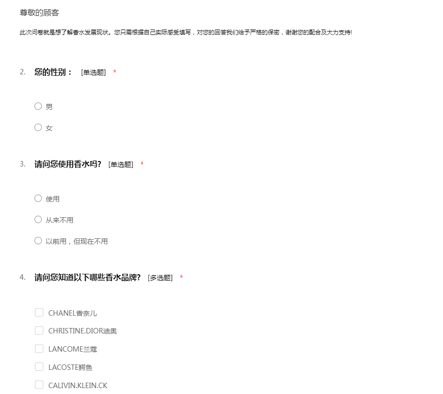 此次问卷就是想了解香水发展现状。您只需根据自己实际感受填写,对您的回答我们给予严格的保密,谢谢您的配合及大力支持!