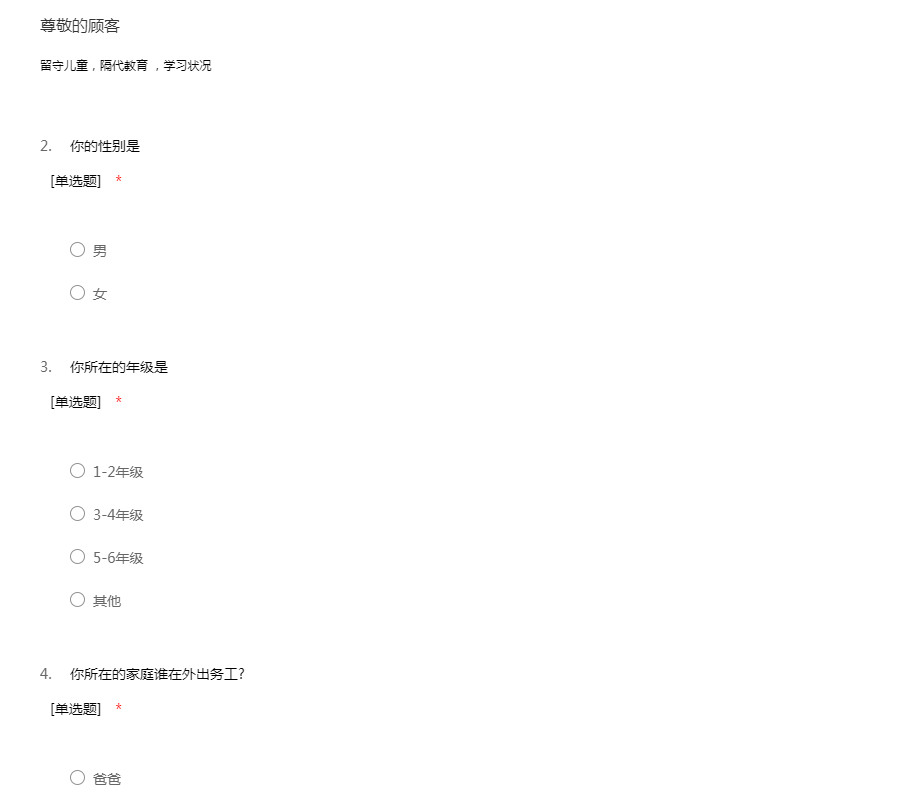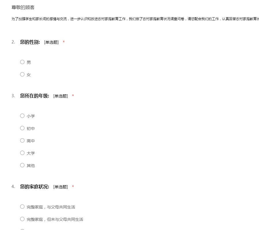 您好!我是天津商业大学的学生,我们正在做一个关于农村教育的社会调查。旨在关注农村儿童青少年的受教育状况以及农村基础教育的发展现状,从而分析得出结论,为农村教育事业的发展提出我们自己的见解,贡献一份力量。本次调查的所有数据信息和结果仅供课题研究使用,绝不用于任何商业目的。希望您能如实填写,为农村的教育事业出一份力,感谢您对我们工作的配合!