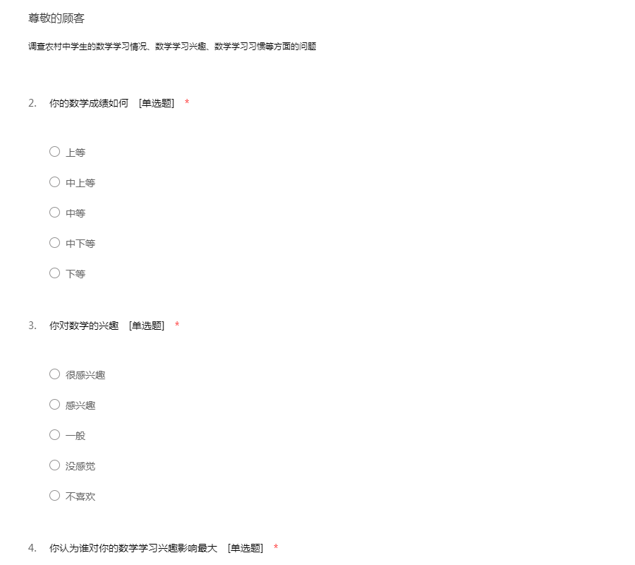调查农村中学生的数学学习情况、数学学习兴趣、数学学习习惯等方面的问题