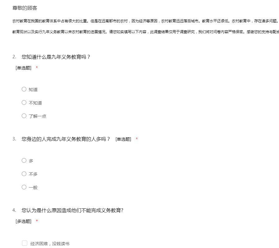 您好!我是天津商业大学的学生,我们正在做一个关于农村教育的社会调查。旨在关注农村儿童青少年的受教育状况以及农村基础教育的发展现状,从而分析得出结论,为农村教育事业的发展提出我们自己的见解,贡献一份力量。本次调查的所有数据信息和结果仅供课题研究使用,绝不用于任何商业目的。希望您能如实填写,为农村的教育事业出一份力,感谢您对我们工作的配合!