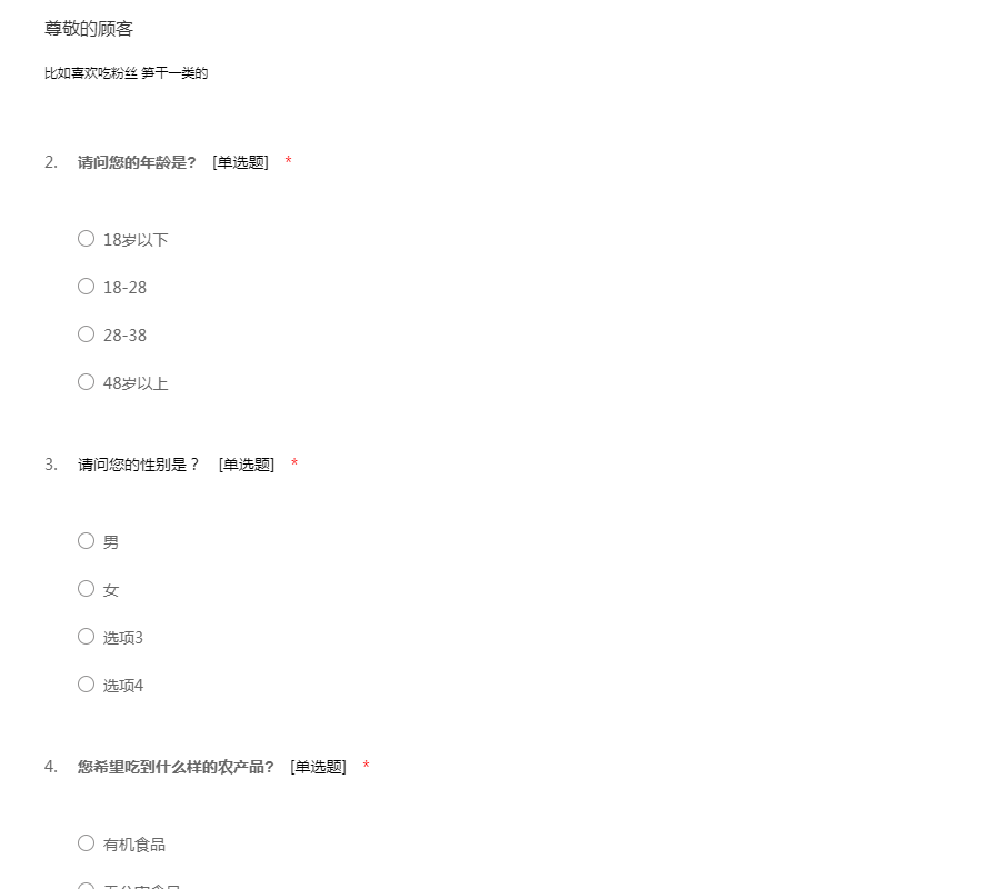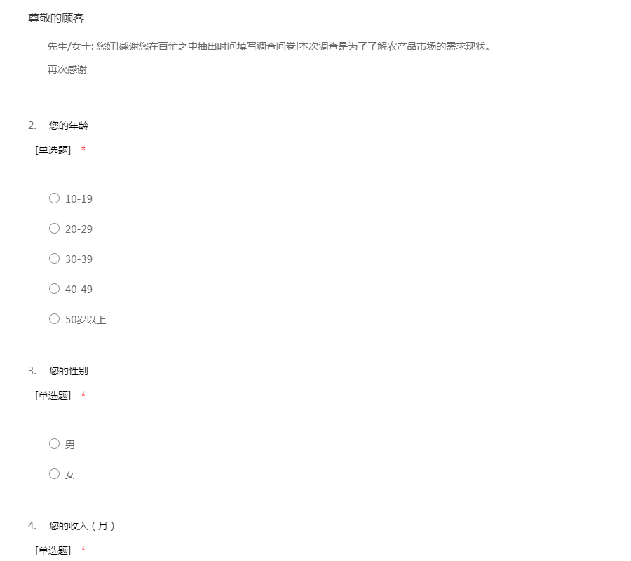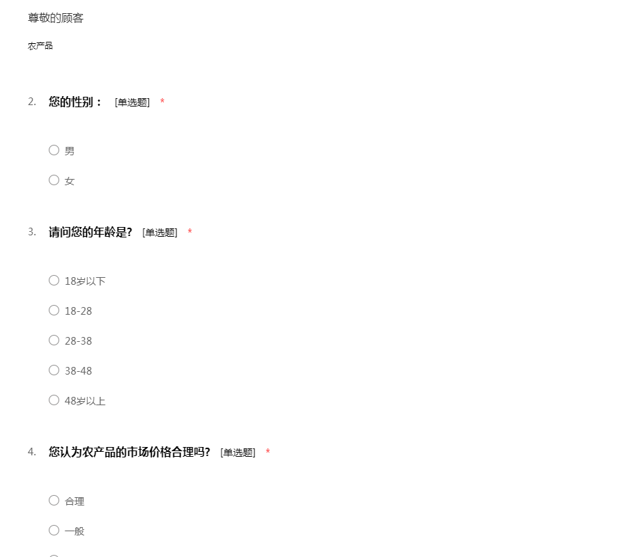 先生/女士: 您好!感谢您在百忙之中抽出时间填写调查问卷!本次调查是为了了解农产品市场的需求现状。 再次感谢