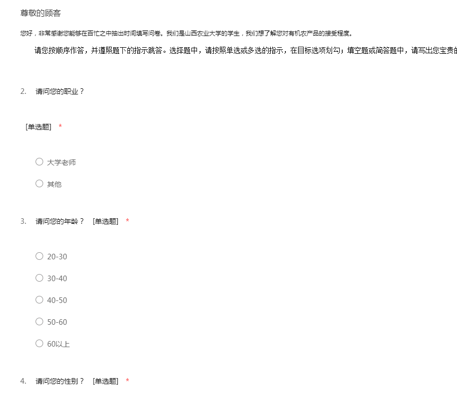 您好,非常感谢您能够在百忙之中抽出时间填写问卷。我们是山西农业大学的学生,我们想了解您对有机农产品的接受程度。请您按顺序作答,并遵照题下的指示跳答。选择题中,请按照单选或多选的指示,在目标选项划勾;填空题或简答题中,请写出您宝贵的答案。非常感谢您的配合!