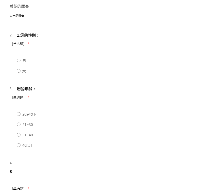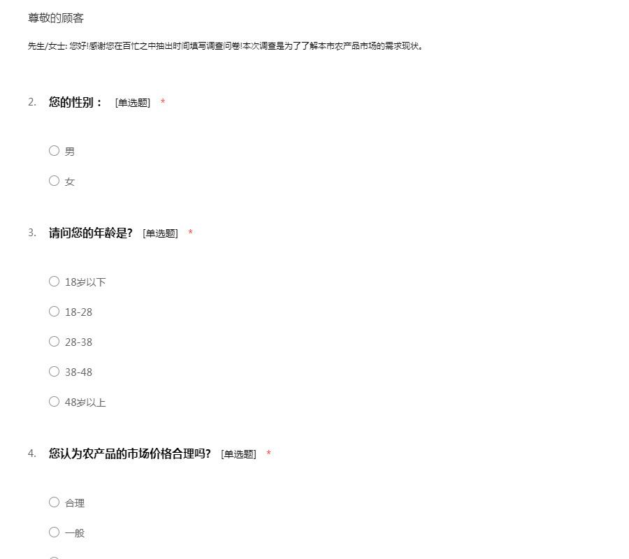 先生/女士: 您好!感谢您在百忙之中抽出时间填写调查问卷!本次调查是为了了解农产品市场的需求现状。 再次感谢
