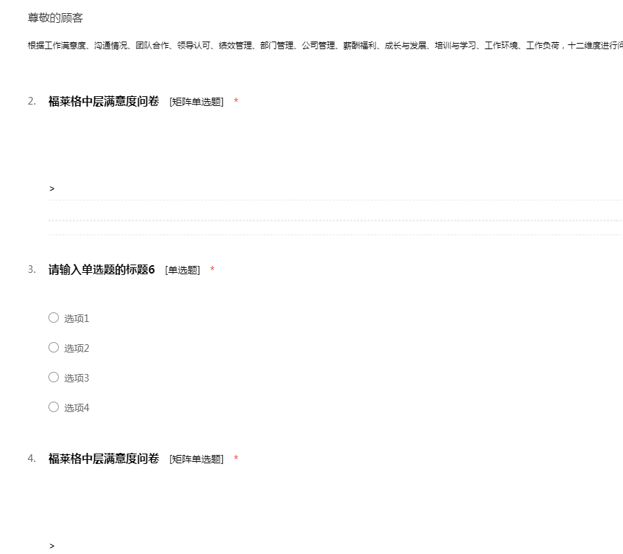 根据工作满意度、沟通情况、团队合作、领导认可、绩效管理、部门管理、公司管理、薪酬福利、成长与发展、培训与学习、工作环境、工作负荷,十二维度进行问卷设计