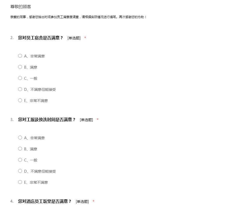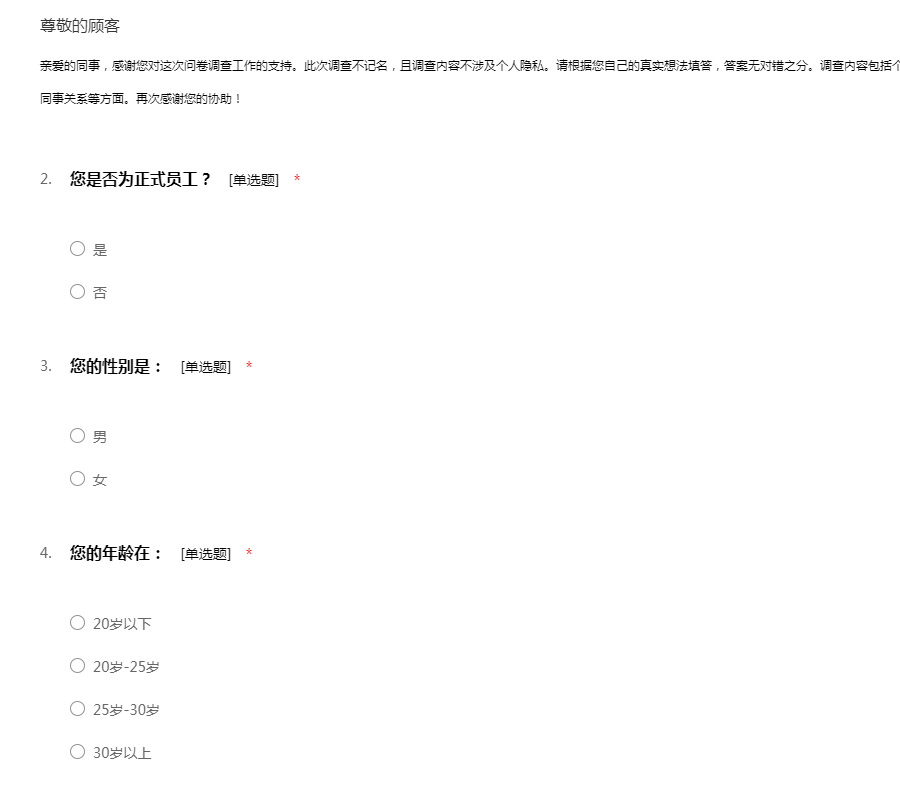 1、为了保障员工权益,本问卷为不记名自填问卷,请认真阅读每个题目和选项;