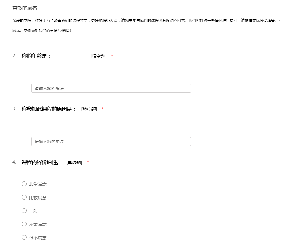 亲爱的学院,你好!为了改善我们的课程教学,更好地服务大众,请您来参与我们的课程满意度调查问卷。我们将针对一些情况进行提问,请根据实际感受填答。问卷不记名,结果仅用于研究改善计划,不必有所顾虑。感谢你对我们的支持与理解!
