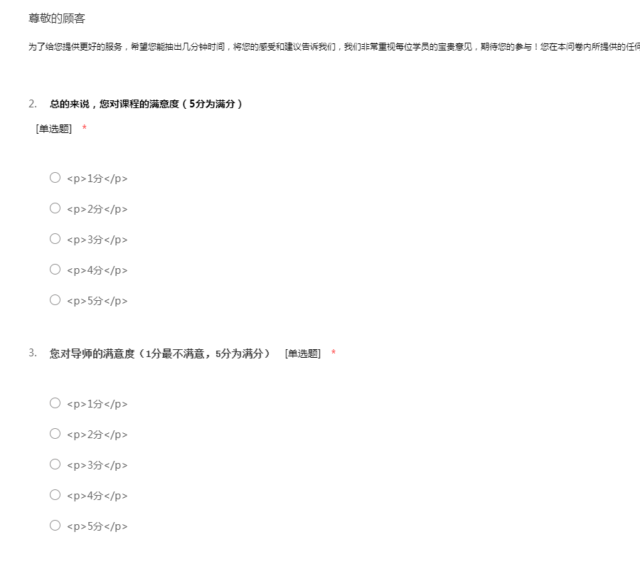 为了给您提供更好的服务,希望您能抽出几分钟时间,将您的感受和建议告诉我们,我们非常重视每位学员的宝贵意见,期待您的参与!您在本问卷内所提供的任何个人信息,我们都不会泄漏或作广告推销之用。