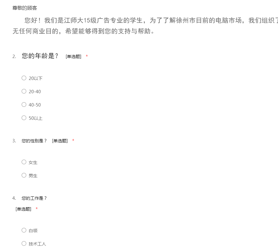 您好!我们是江师大15级广告专业的学生,为了了解徐州市目前的电脑市场,我们组织了这次问卷调查,此问卷绝无任何商业目的,希望能够得到您的支持与帮助。