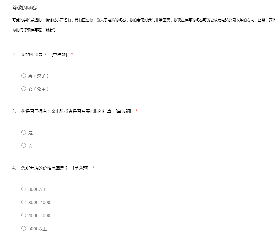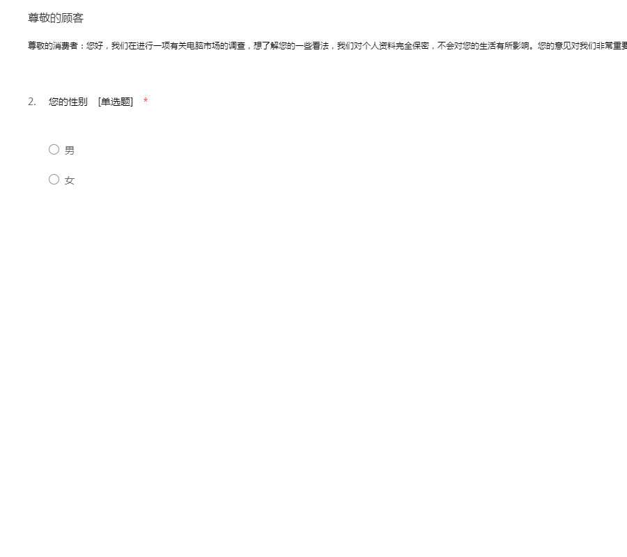 尊敬的先生女士: 你好!为了进一步了解大家购买电脑的情况,对电脑的需求和消费水平进行研究,现决定开展此次调查问卷。本问卷采取无记名形式,绝对保护您的隐私,感谢你抽出宝贵时间参与我们的调查。