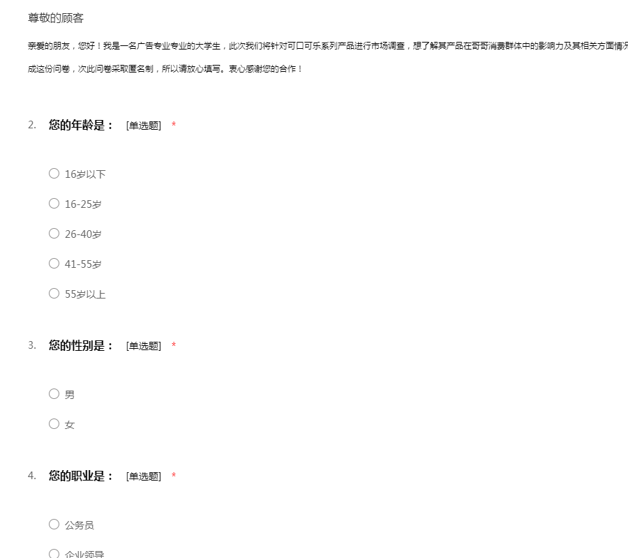亲爱的朋友,您好!我是一名广告专业专业的大学生,此次我们将针对可口可乐系列产品进行市场调查,想了解其产品在哥哥消费群体中的影响力及其相关方面情况。希望您能抽出几分钟的宝贵时间来帮助我们完成这份问卷,次此问卷采取匿名制,所以请放心填写。衷心感谢您的合作!